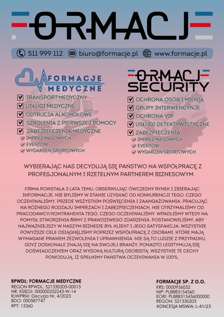 Firma powstała 3 lata temu. Obserwując ówczesny rynek i zbierając informacje, nie byliśmy w stanie uzyskać od konkurencji tego, czego oczekiwaliśmy. Przede wszystkim poświęcenia i zaangażowania. Pracując na różnego rodzaju imprezach i zabezpieczeniach, nie otrzymaliśmy od pracodawcy/kontrahenta tego, czego oczekiwaliśmy. Wpadliśmy wtedy na pomysł stworzenia firmy z prawdziwego zdarzenia. Postanowiliśmy, aby najważniejszy w naszym biznesie był klient i jego satysfakcja. Wszystkie powyższe cele osiągnęliśmy poprzez współpracę z osobami, które mają wymagane prawem zezwolenia i uprawnienia. Nie są to ludzie z przypadku, gdyż doskonale znają się na swojej branży, ponadto legitymują się doświadczeniem oraz wysoką kulturą osobistą. Wszystkie te cechy powodują, iż spełnimy Państwa oczekiwania w 100%.
